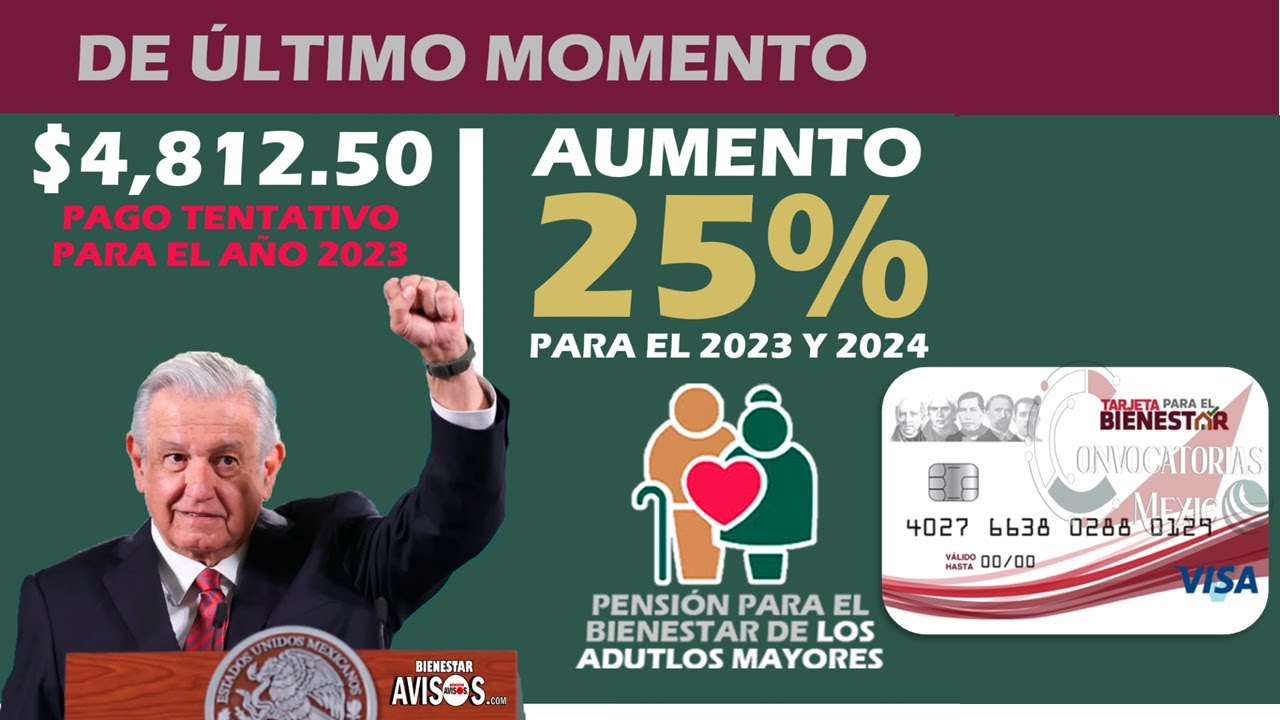 Actualmente, la pensión para las personas adultas mayores es de 3 mil 850 pesos por bimestre, por lo que si se aplicara el aumento que anunció el mandatario, el apoyo en 2023 quedaría de 4 mil 812.5 pesos.