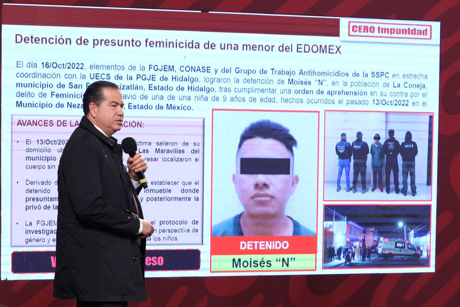 Mencionó que por este delito se aprehendió a Moisés “N”, en el municipio de San Felipe Orizatlán, Hidalgo, acusado de abusar y asesinar a una niña de nueve años.