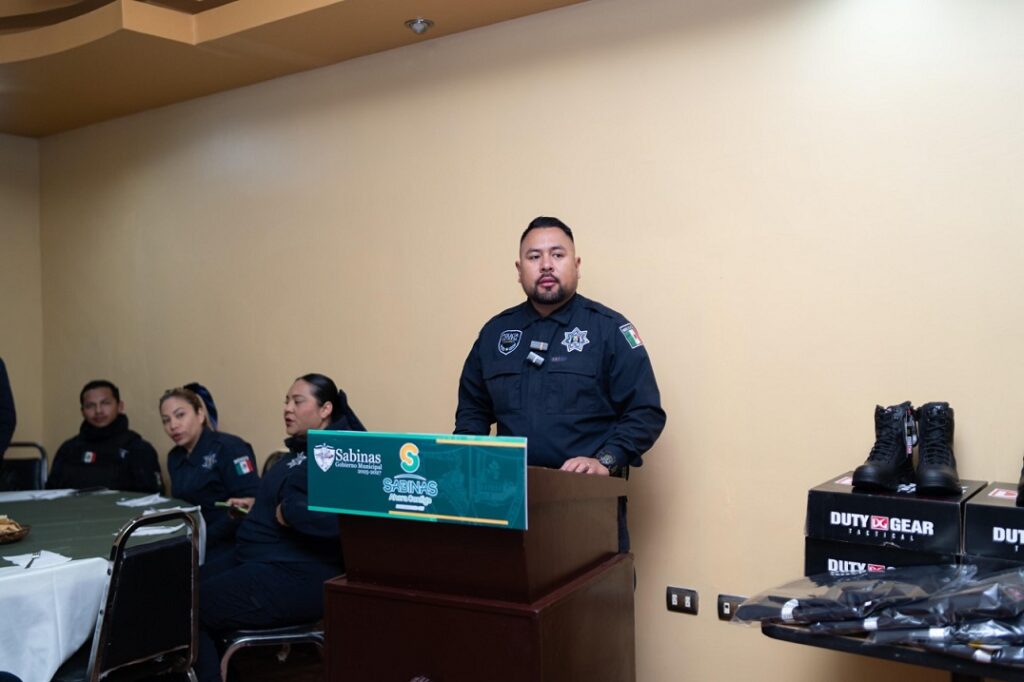 Homologar los salarios al nivel de los policías del estado, así como mejorar las prestaciones y mantener una constante capacitación técnica, ha sido el acuerdo establecido por el alcalde de Sabinas, José Feliciano “Chano” Díaz Iribarren, con los elementos policiacos al encabezar esta mañana el festejo por el Día Internacional del Policía, ceremonia donde además de disfrutar de un exquisito desayuno se entregaron uniformes y reconocimientos a dos destacados elementos.