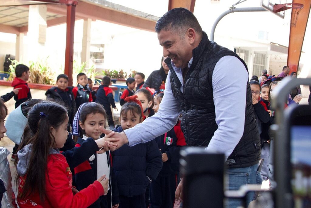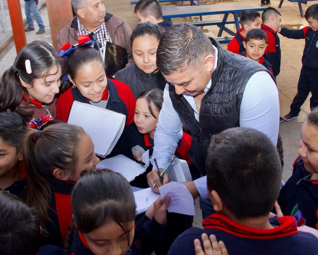Desde su llegada a la escuela, el presidente municipal fue recibido con beneplácito por los alumnos quienes pudieron convivir y hasta pedirle una firma que plasmaron en papel, objetos personales, hasta en el calzado.