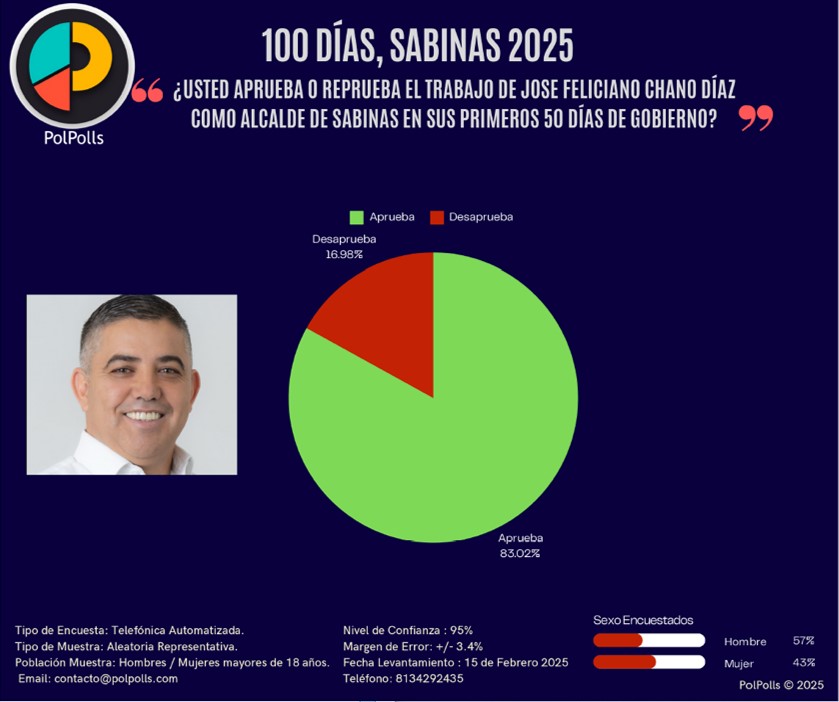 Sobre la aprobación ciudadana la empresa encuestadora Pol Polls, revela que en los primeros 50 días de Gobierno, el alcalde de Sabinas obtuvo la calificación histórica más alta con el 83 Por Ciento.