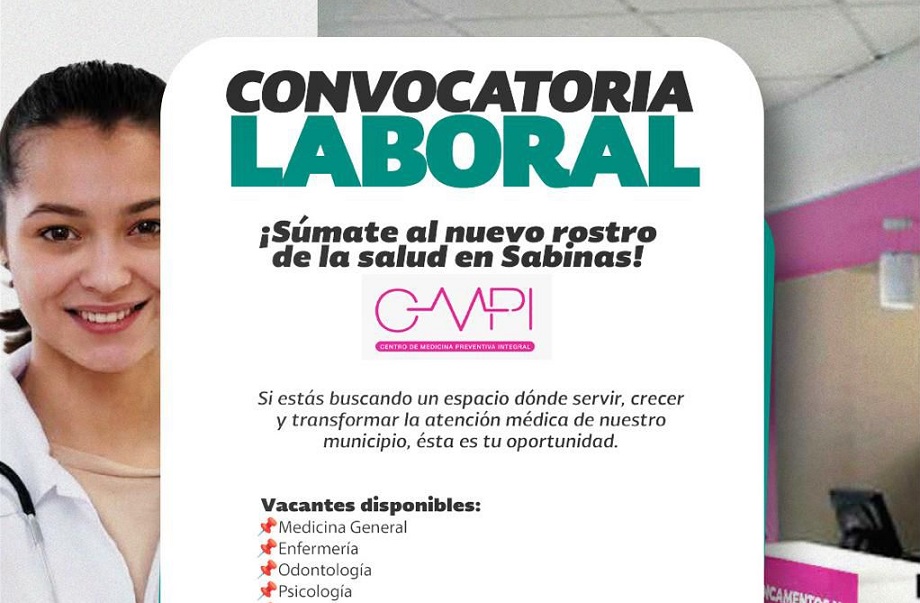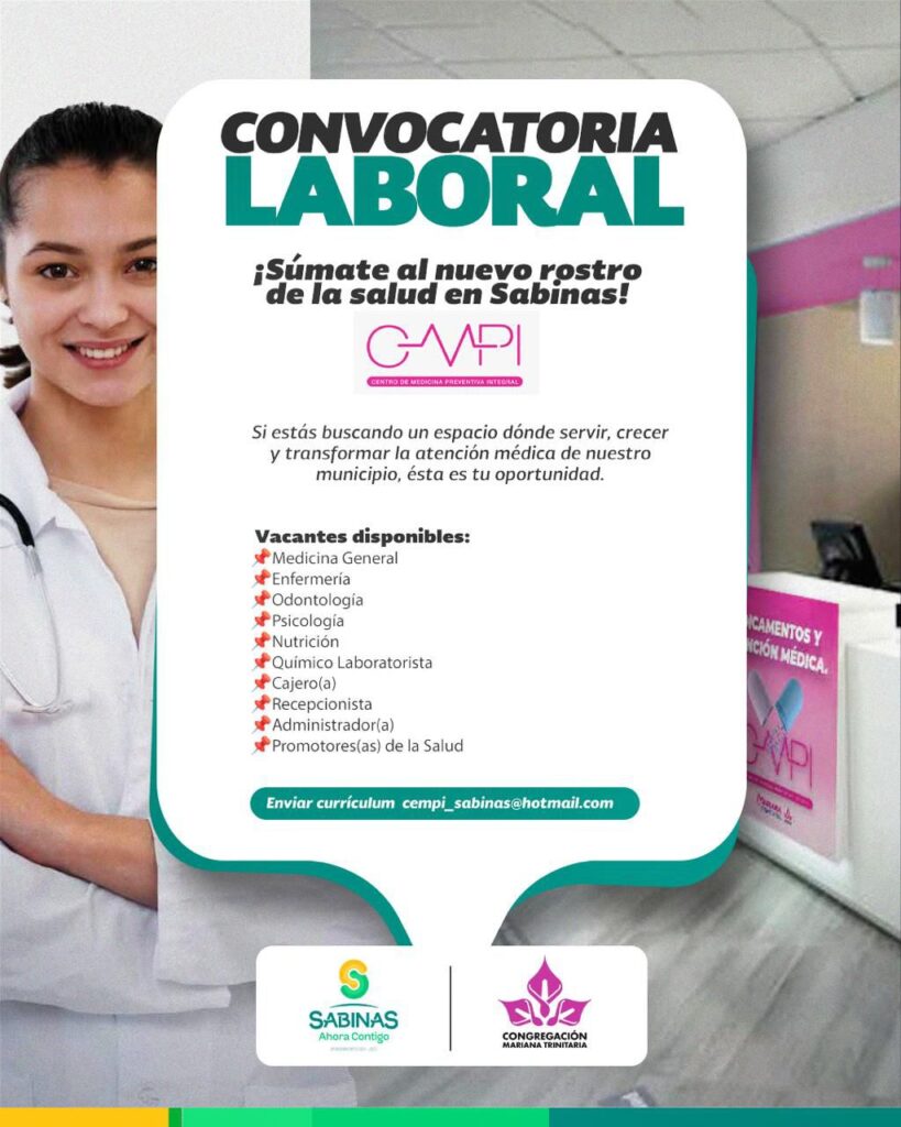 Sabinas, Coah.- El Centro Médico de Prevención Integral abre su convocatoria laboral para cubrir más de 100 vacantes en distintas áreas del centro.