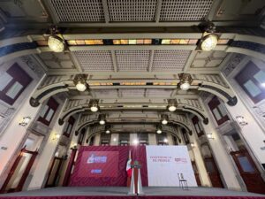 Cuando entré al salón, lo primero que vi es la gran mesa ovalada y de madera, tiene tres o cuatro pantallas dentro de ella en donde se presenta la información, además de sillas móviles y micrófonos. Al final, resaltan el escudo de México que dice Presidencia de la República y una bandera ubicada al lado izquierdo.