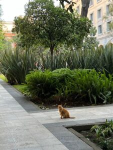 Nosotros volvimos a pasar por el Jardín Nezahualcóyotl y nos topamos con los gatos de Palacio Nacional, especialmente con Zeus, el gato blanco consentido de los periodistas y que siempre ronda la sala de prensa. Tomamos nuestras cosas e ingresamos como ya es de forma habitual, a la conferencia.