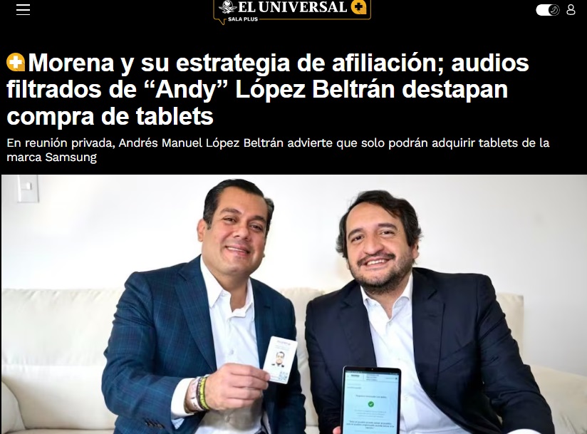 La nota publicada por El Universal, con el título «Morena y su estrategia de afiliación; audios filtrados de Andy López Beltrán destapan compra de tablets» anuncia como una primicia que el dirigente partidista pidió a las y los diputados de Morena redoblar esfuerzos para afiliar a ciudadanos al movimiento.