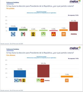 La encuesta fue elaborada por Mendoza Blanco, donde Claudia Sheinbaum, con la coalición Morena, Partido del Trabajo y Partido Verde, tiene 59.2 por ciento por 33 por ciento de Xóchitl Gálvez y 7.8 por ciento de Jorge Álvarez Máynez, todo esto a menos de cuatro meses de que se lleve a cabo el proceso electoral, pactado para el 2 de Junio de este 2024.