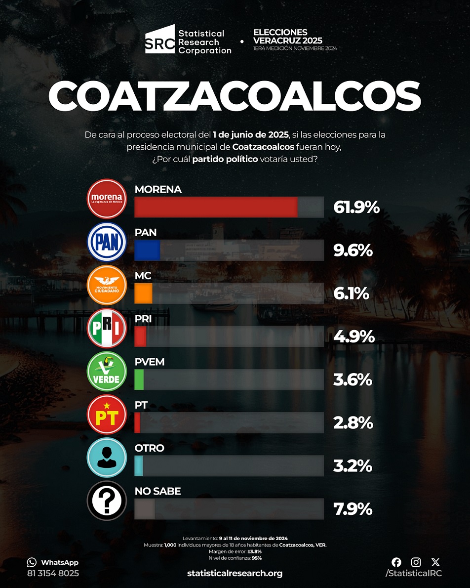 En Coatzacoalcos, Morena también se perfila como el favorito para la presidencia municipal con 42.6% de la intención de voto.