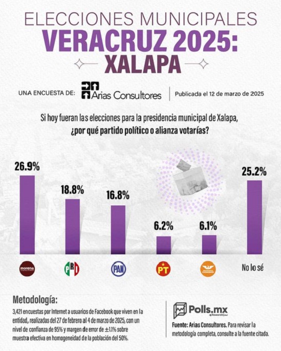 De acuerdo con la encuesta de Arias Consultores, en Xalapa, por ejemplo, Morena lidera las tendencias electorales para la presidencia municipal con 26.9% de la intención de voto.