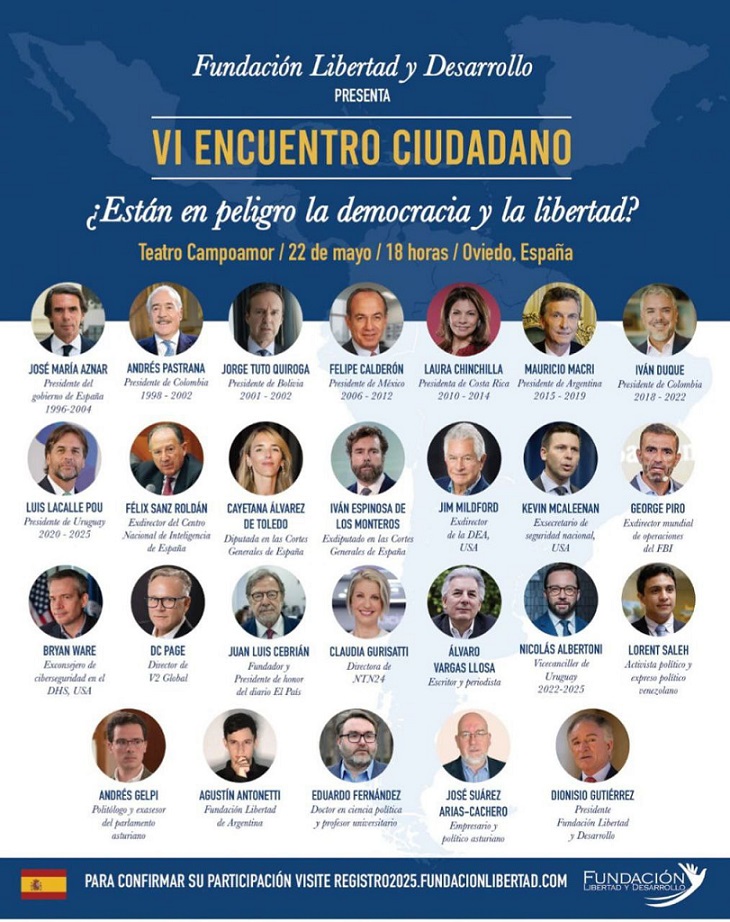 En su intervención, Calderón lamentó que “el Grupo de Puebla y el Foro de Sao Paolo” han logrado coronar a sus peones y poner en el poder, curiosamente por vías democráticas: Daniel Ortega y Hugo Chávez.