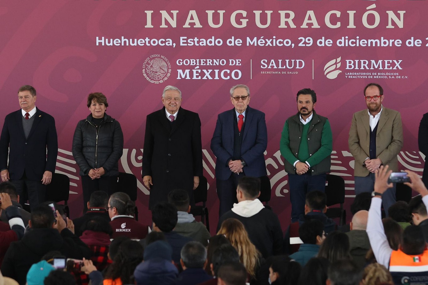 El Presidente AMLO grita: “¡Que viva Huehuetoca! ¡Que viva el Estado de México! ¡Viva México! ¡Viva México! ¡Viva México!”. Se corta el listón de la Megafarmacia. Y se canta el himno nacional.