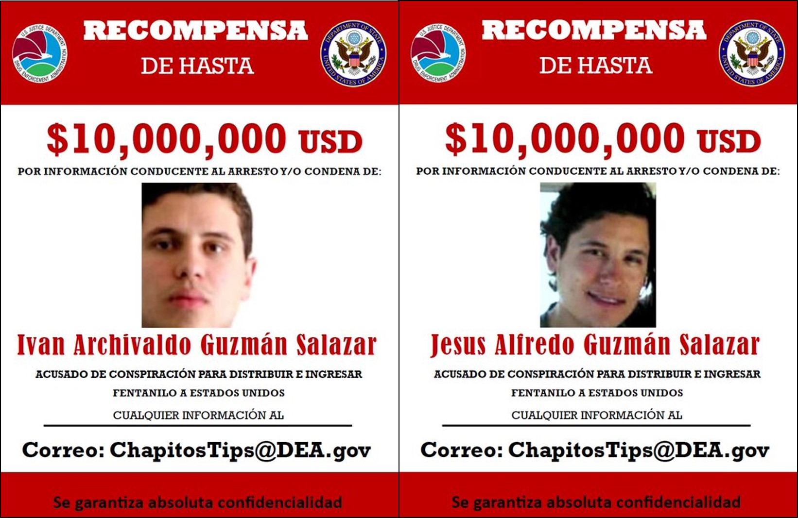Aunque las fotos de Jesús Alfredo Guzmán Salazar e Iván Archivaldo Guzmán Salazar no son recientes, sí lo es el monto que se ofrece por información que ayude a su captura.