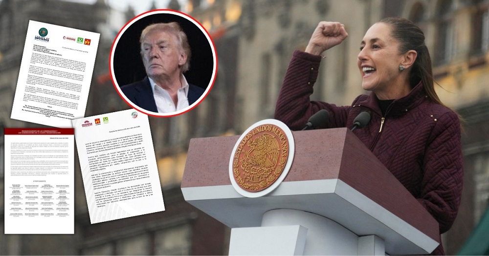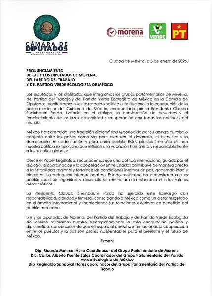 “Manifestamos nuestro respaldo político e institucional a la conducción de la política exterior del Gobierno de México, encabezado por la Presidenta Claudia Sheinbaum Pardo, basada en el diálogo, la construcción de acuerdos y el fortalecimiento de los lazos de amistad y coopearación con todas las naciones del mundo”, se lee en el pronunciamiento emitido por diputadas y diputados de Morena, el Partido del Trabajo (PT) y el Verde Ecologista de México (PVEM).