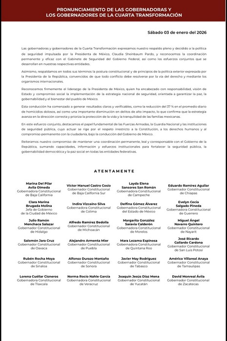 También las y los mandatarios estatales de la Cuarta Transformación en este país, respaldaron a Sheinbaum. “Reconocemos firmemente el liderazgo de la Presidenta de México, quien ha encabezado con responsabilidad, visión de Estado y compromiso social la implementación de la estrategia nacional de seguridad, orientada a garantizar la paz, la gobernabilidad y el bienestar del pueblo de México”, se pronunciaron las y los gobernadores de la 4T.