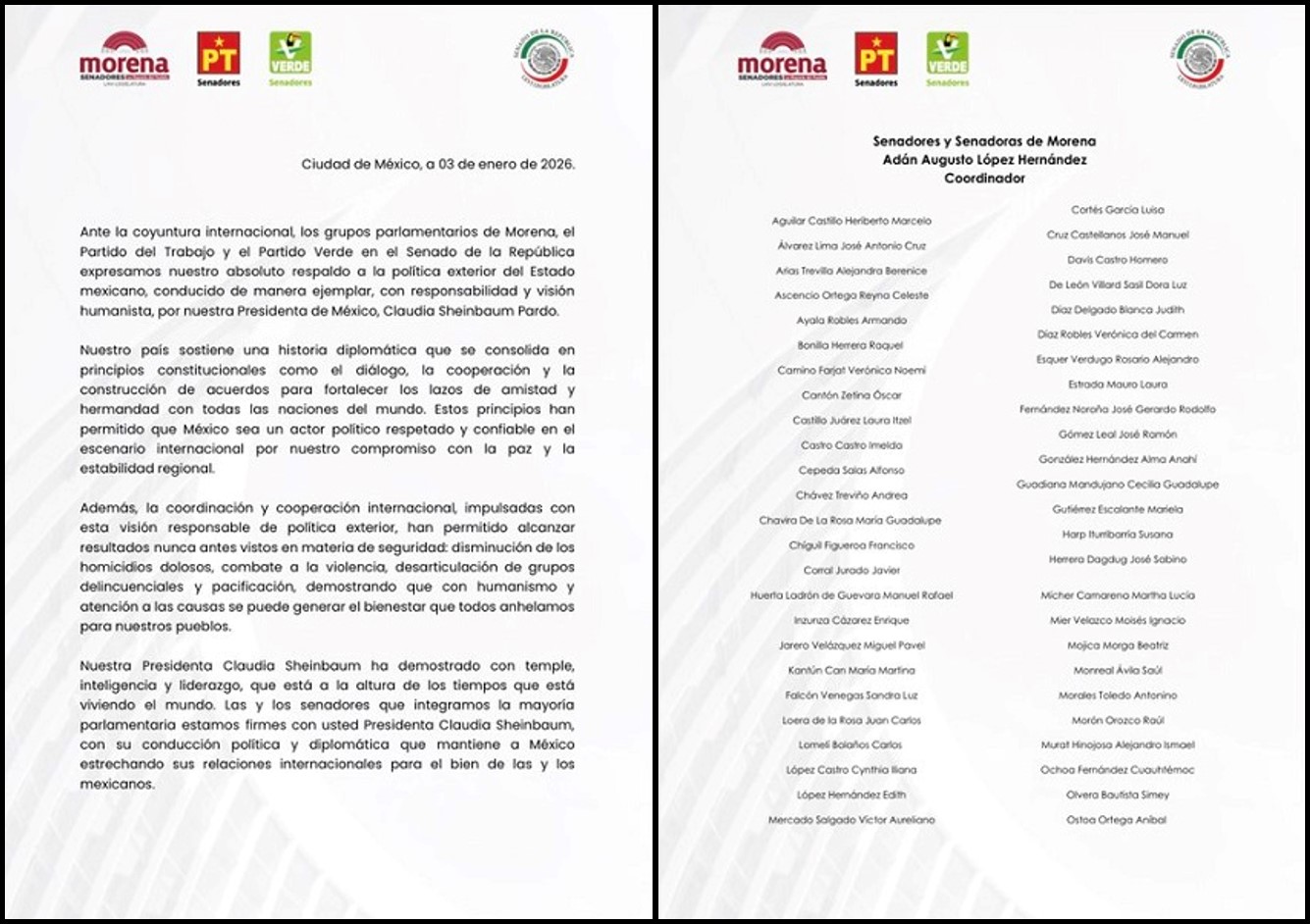 “Manifestamos nuestro respaldo político e institucional a la conducción de la política exterior del Gobierno de México, encabezado por la Presidenta Claudia Sheinbaum Pardo, basada en el diálogo, la construcción de acuerdos y el fortalecimiento de los lazos de amistad y coopearación con todas las naciones del mundo”, se lee en el pronunciamiento emitido por diputadas y diputados de Morena, el Partido del Trabajo (PT) y el Verde Ecologista de México (PVEM).