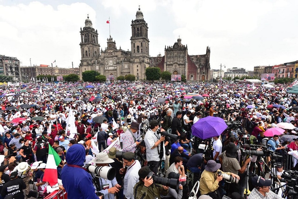 El mandatario llegó al Zócalo de la Ciudad de México alrededor de las 10:37 horas. Antes de subir al templete saludó a su esposa Beatriz Gutiérrez Müller y a la presidenta electa, Claudia Sheinbaum Pardo. Ya lo esperaba una multitud que se dio cita en la plancha desde horas antes.