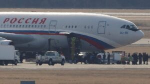 Avión ruso recogiendo diplomáticos expulsados del aeropuerto internacional de Dulles en Chantilly, Virginia, EE.UU