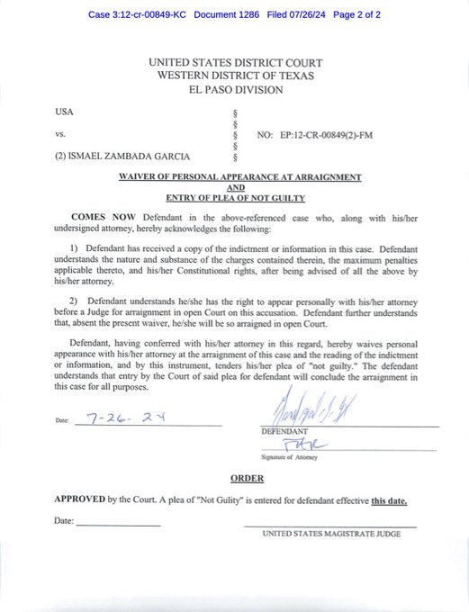 Detenido el 25 de Julio, rechazó estar presente en la audiencia en la Corte del Distrito Oeste de Texas, pero a través de su representación legal conoció las acusaciones en su contra y se declaró “no culpable”.