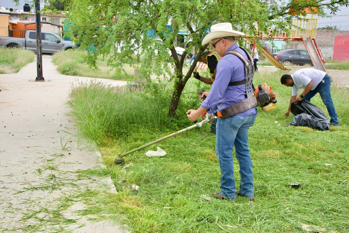 Sabinas, Coah.- Como parte del compromiso de mantener espacios públicos dignos y seguros para todas las familias, el alcalde de Sabinas, José Feliciano “Chano” Díaz Iribarren, respondió de manera inmediata a la petición de los comités ciudadanos para realizar labores de limpieza en la plaza de la colonia Los Manzanos.