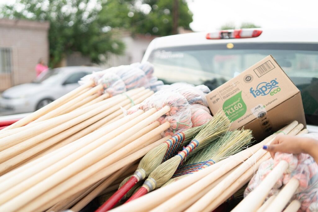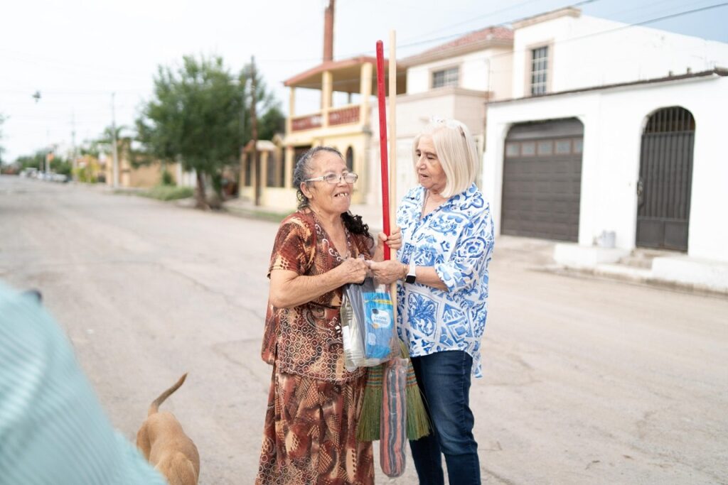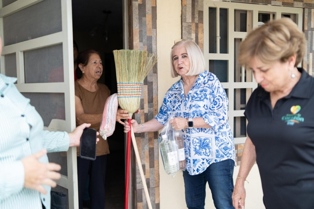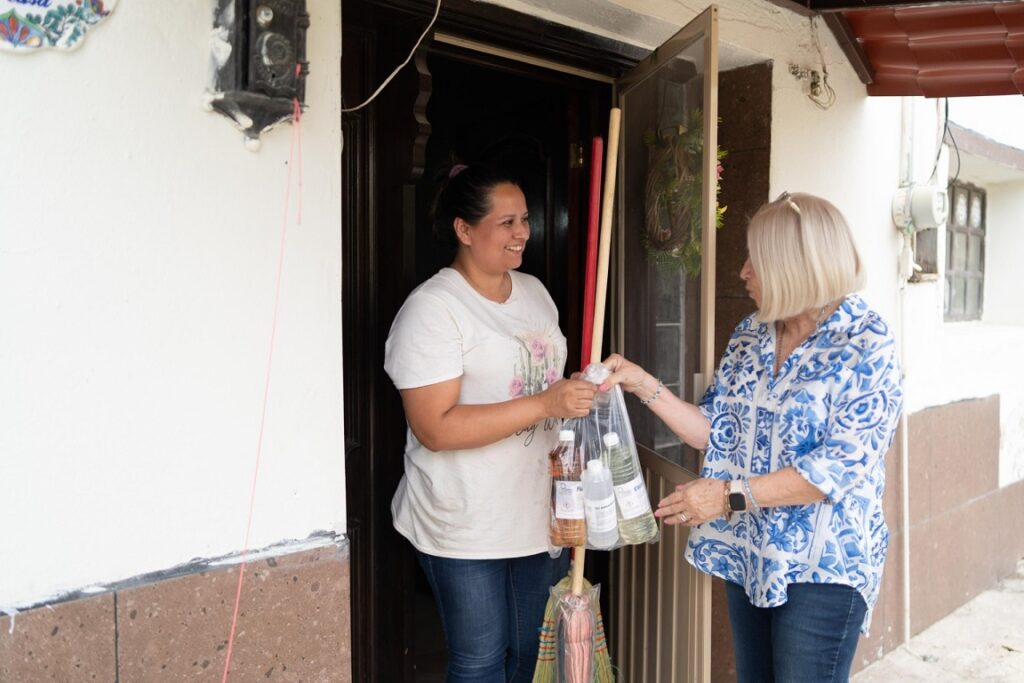Cada paquete contiene cloro, pinol, un par de guantes, trapeador, escoba y bolsas para basura, indicó la Sra. Alma Iribarren, al concluir junto a funcionarios del sistema el recorrió por la colonia Centenario.