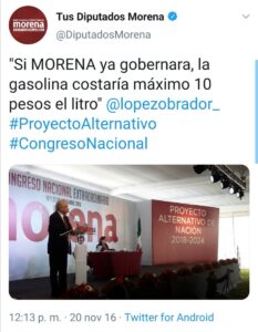 El 20 de noviembre del 2016 en su permanente campaña a la presidencia Amlo manifestó: “si Morena estuviera gobernando en estos momentos, la gasolina no valdría 14 pesos, costaría cuando mucho lo que cuesta en Estados Unidos: 10 pesos el litro”.
