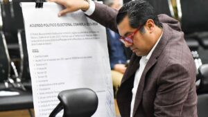 Diputado de Morena colocó una mampara con el acuerdo revelado por el dirigente del PAN, Marko Cortés.