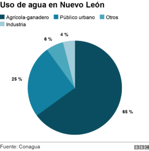 En entrevista con BBC Mundo, Antonio Hernández, pone como ejemplo que la acerera Ternium, la empresa con mayor concesión de agua en el estado, cuente con un volumen de líquido que supone “el 98% de lo que requeriría la población de Monterrey”.