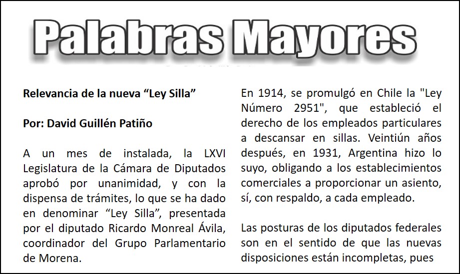 A un mes de instalada, la LXVI Legislatura de la Cámara de Diputados aprobó por unanimidad, y con la dispensa de trámites, lo que se ha dado en denominar “Ley Silla”, presentada por el diputado Ricardo Monreal Ávila, coordinador del Grupo Parlamentario de Morena.