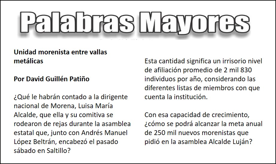 ¿Qué le habrán contado a la dirigente nacional de Morena, Luisa María Alcalde, que ella y su comitiva se rodearon de rejas durante la asamblea estatal que, junto con Andrés Manuel López Beltrán, encabezó el pasado sábado en Saltillo?