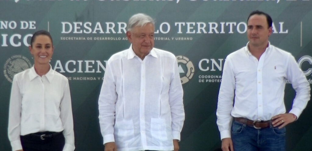 El gobernador de Coahuila, Manolo Jiménez, dio la bienvenida y echó porras a la virtual presidenta electa, Claudia Sheinbaum, y al presidente Andrés Manuel López Obrador, durante su visita a San Juan de Sabinas para la presentación del Plan de Justicia para Pasta de Conchos.