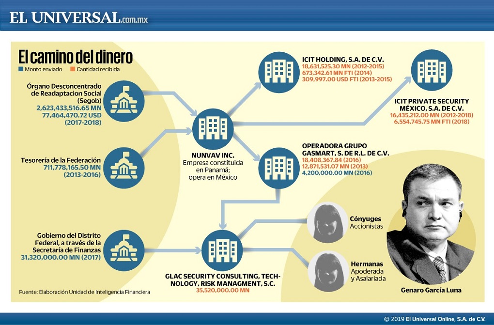 La Unidad de Inteligencia Financiera (UIF) informó que el esquema de corrupción del que fue partícipe Genaro García Luna, ex secretario de seguridad de Felipe Calderón y hoy preso por narcotráfico en Estados Unidos, trianguló alrededor de 745 Millones 900 Mil Dólares del erario público a través de empresas fachada en paraísos fiscales.