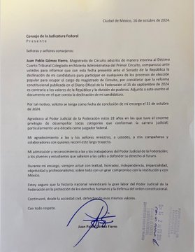 “Asimismo, solicité al Consejo de la Judicatura Federal concluir mi gestión el 31 de octubre de 2024”.