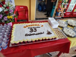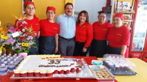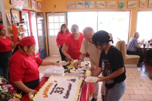 Sabinas, Coah.- El Restaurante Gardenias, este lunes 18 de Septiembre, celebró 33 años de atender a la clientela y su propietario Jorge Cárdenas Garza junto con su esposa y empleadas del lugar, compartió con sus clientes un pastel para conmemorar el aniversario.