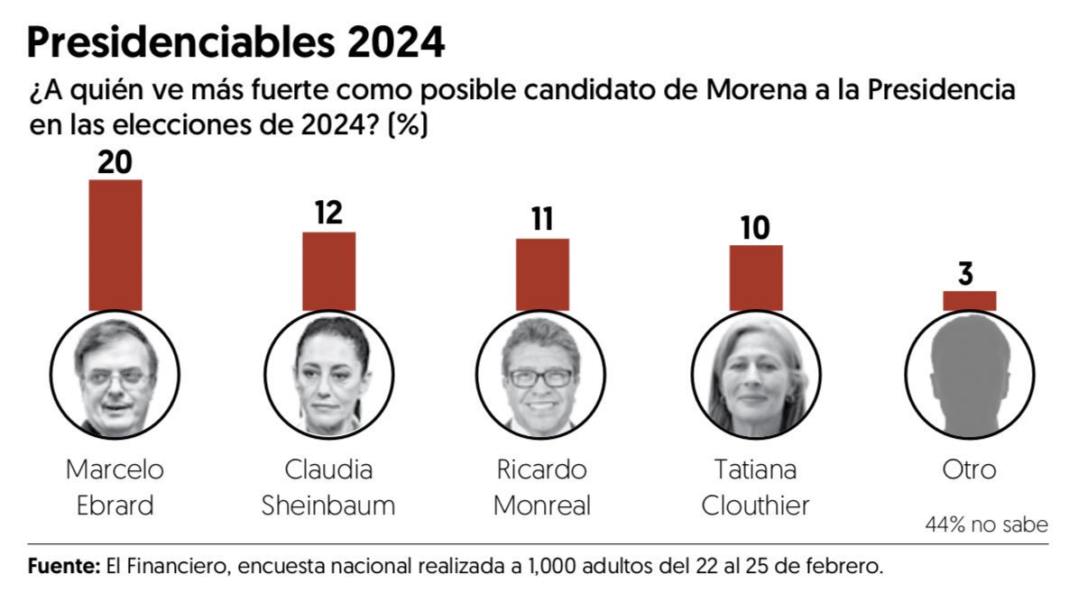En la encuesta, Marcelo ocupa el primer lugar con 37%, Claudia el segundo con 29% y Ricardo con 14%, después Tatiana Clouthier quien aparece con 6%.