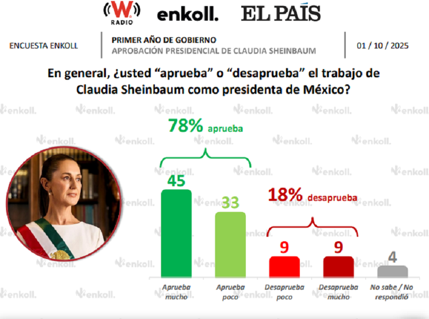 Con 78% de aprobación, supera incluso el registro que obtuvo Andrés Manuel López Obrador en su primer año (72%) y se coloca como la mandataria mejor evaluada desde el 2000, cuando se produjo la alternancia pactada tras más de siete décadas de gobiernos priistas, según reveló la encuesta nacional de Enkoll para El País y W Radio.