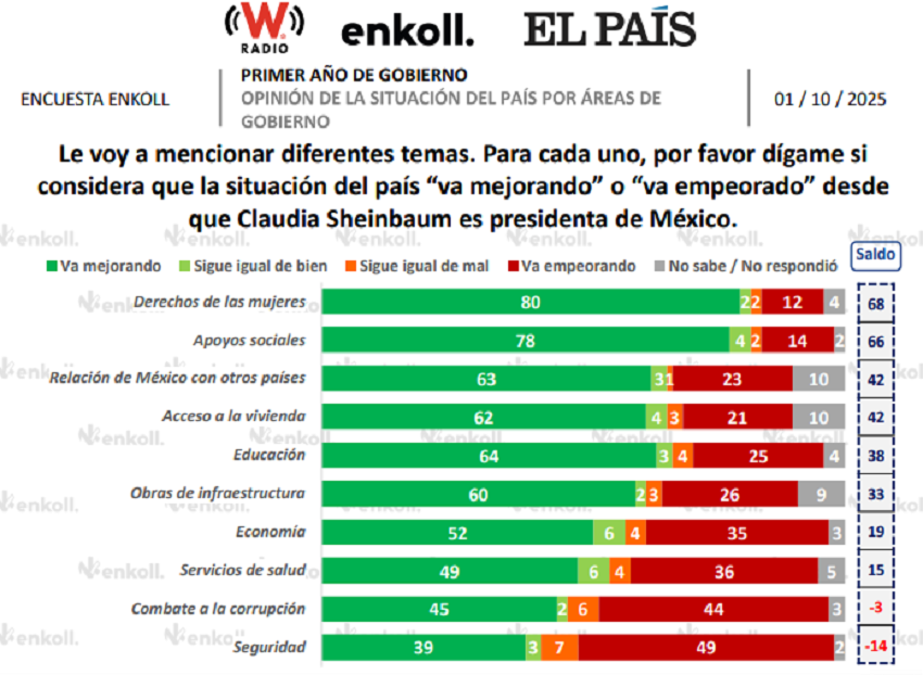Además el gobierno presume una reducción de 32% en homicidios a nivel nacional, con caídas de hasta 63% en estados como Nuevo León. Sin embargo, apenas 7% de los ciudadanos reconoce la seguridad como un logro. En cambio, la inseguridad y el narcotráfico son vistos como el principal problema del país por 52% de los encuestados.