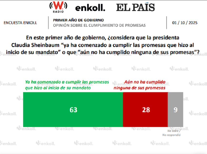 En términos de imagen, 63% considera positiva la figura de Sheinbaum, mientras que 28% asegura que no ha cumplido sus promesas y 9% no respondió.