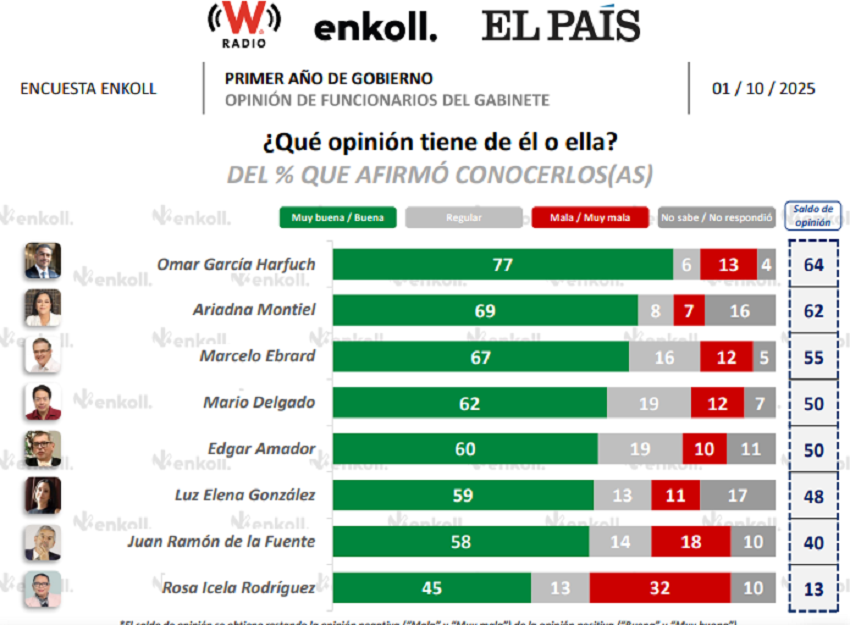 En su gabinete, el funcionario mejor evaluado es el secretario de Seguridad, Omar García Harfuch (77%), seguido de la secretaria de Bienestar, Ariadna Montiel (69%), y el secretario de Economía, Marcelo Ebrard (67%), quien encabeza la renegociación del tratado comercial con Estados Unidos.