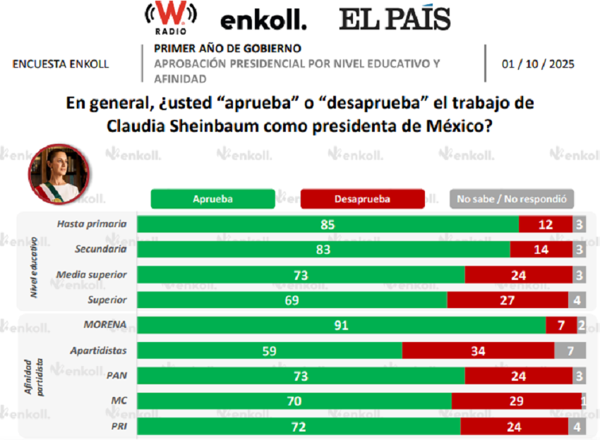 Incluso entre votantes opositores, la presidenta logra cifras inusuales: 73% de los simpatizantes del PAN, 70% de Movimiento Ciudadano y 72% del PRI aprueban su gestión.