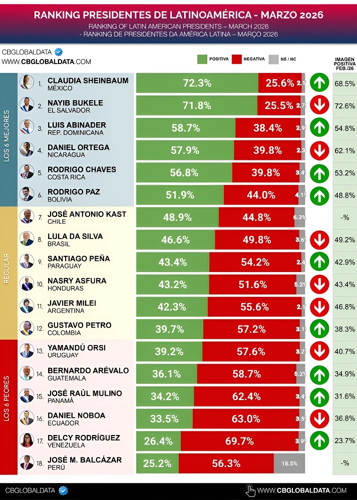 La presidenta de México, Claudia Sheinbaum Pardo encabeza el ranking de imagen positiva entre 18 mandatarios de la región, según el estudio mensual de CB Global Data correspondiente a Marzo de 2026.