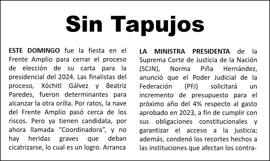 ESTE DOMINGO fue la fiesta en el Frente Amplio para cerrar el proceso de elección de su carta para la presidencial del 2024. Las finalistas del proceso, Xóchitl Gálvez y Beatriz Paredes, fueron determinantes para alcanzar la otra orilla. Por ratos, la nave del Frente Amplio pasó cerca de los riscos. Pero ya tienen candidata, por ahora llamada “Coordinadora”, y no hay heridas graves que deban cicatrizarse, lo cual es un logro. Arranca ahora un periodo inédito, una dimensión desconocida, que será una larguísima campaña, ya con los candidatos destapados, en la que formalmente no se podrá hacer campaña. Muy raro.